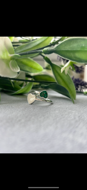 Solid silver adjustable ring with two solid back heart shaped settings for your inclusions. Large heart approx. 8mm small heart 6mm.