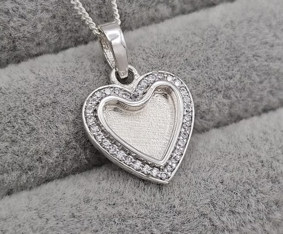 Our Silver Heart Pendants are made using fine 925 Silver and framed by sparkling Cubic Zirconia, are of high quality and are especially designed to hold your inclusions. Dimensions- H 14mm x W 14mm x D 2mm